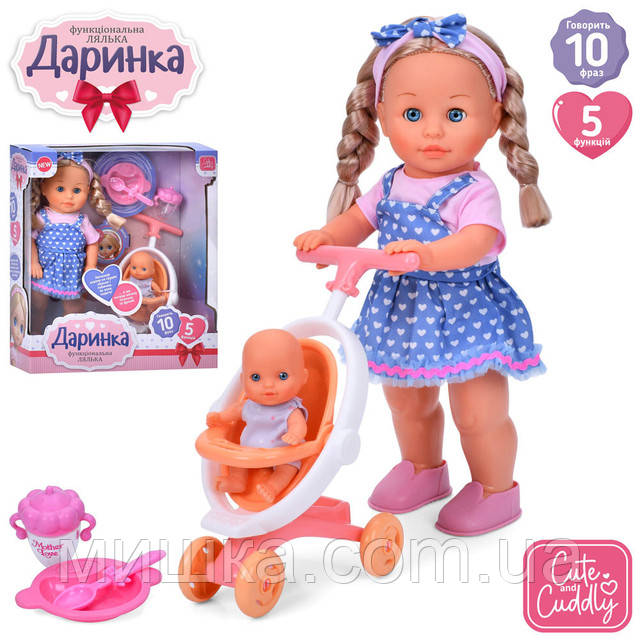 Лялька-пупс інтерактивна, 40 см ходить, читає вірші, співає пісеньку (укр. мова), 5 функцій, 10 фраз, коляска з малюком (13 см), "Даринка та маленька сестричка" М5955 UA