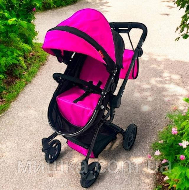 Коляска для ляльки з сумкою 9695 Carrello малинова, зимова, з поворотними колесами, перекидною ручкою, складним капюшоном, містким багажним кошиком.